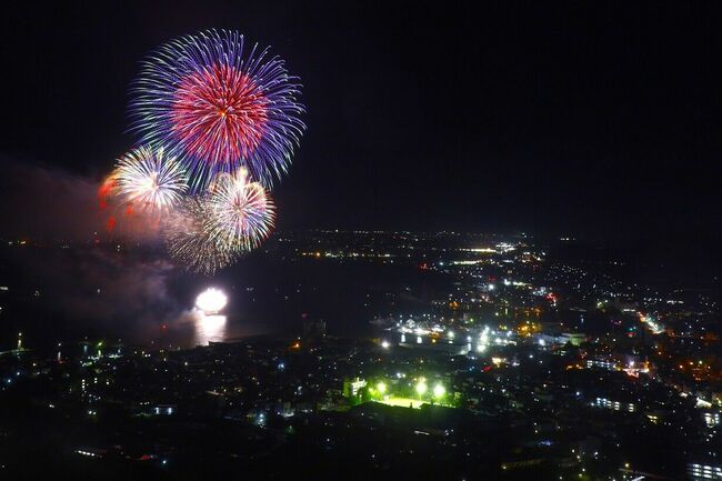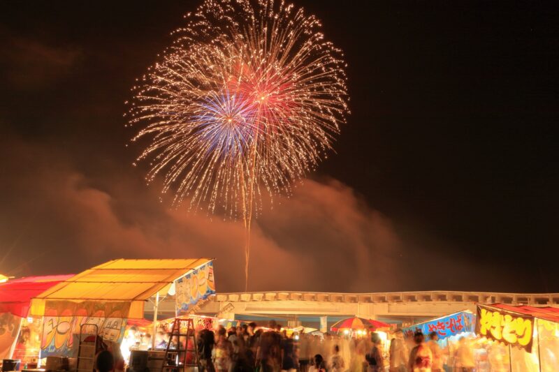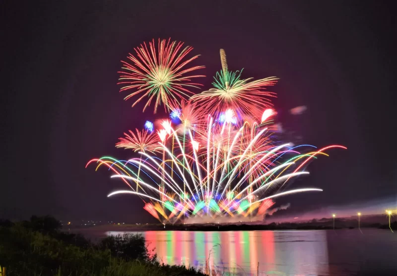 2025年で47回目を迎える歴史ある花火大会で、大迫力の大玉花火が夜空に咲き誇り、その壮大な美しさはぜひ生で楽しみたい。
