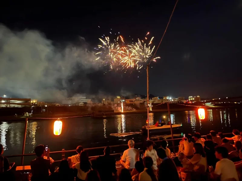花火大会では、水上スターマインやジャンボスターマインなど、様々な種類の花火が打ち上げられ、多くの人で賑わいます。