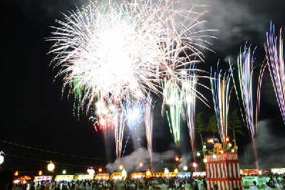 やぐらの提灯と屋台の電飾がきらめく河川敷の夜空に、音楽やレーザーの演出に合わせて約2,000発の色とりどりの花火が打ち上がります。