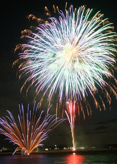 防波堤近くから打ち上がる花火は、色とりどりの花火が海面と夜空を埋めつくし迫力満点。