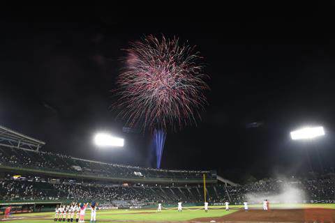 試合中盤の5回裏終了時にスタジアム上空に美しい花火が打ち上がり、観客席から間近で迫力の光と音を体感できます。
