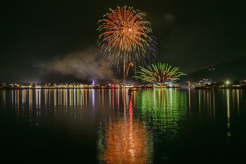 水中花火を含む約2,000発の花火が港の中心から打ち上げられ、色とりどりの花火が夜空と海面を埋め尽くすようすは圧巻。