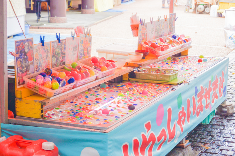 ポイが破れるまで何度も挑戦したくなるスーパーボールすくいや金魚すくいも根強い人気を誇ります。
